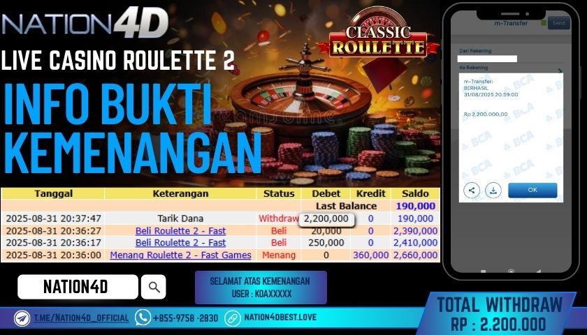 Selamat Kepada Member Setia NATION4D dengan USER ID : KOA*** LIVE CASINO ROULETTE 2 Sebesar RP. 2,200,000 – LUNAS langsung mendarat ke rekening tanpa bertele – tele. Terimakasih telah mempercayakan NATION4D sebagai Situs Bandar Terpercaya dan Terjamin Aman! Tunggu apalagi? Daftar sekarang juga bersama NATION4D dan dapatkan berbagai promo menarik setiap harinya.