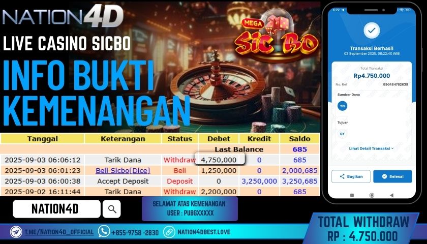 Selamat Kepada Member Setia NATION4D dengan USER ID : PUBG*** LIVE CASINO SICBO Sebesar RP. 4,750,000 – LUNAS langsung mendarat ke rekening tanpa bertele – tele. Terimakasih telah mempercayakan NATION4D sebagai Situs Bandar Terpercaya dan Terjamin Aman! Tunggu apalagi? Daftar sekarang juga bersama NATION4D dan dapatkan berbagai promo menarik setiap harinya.