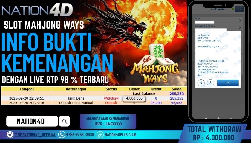 Selamat Kepada Member Setia NATION4D dengan USER ID : JUNG*** SLOT MAHJONG WAYS Sebesar RP. 4,000,000 – LUNAS langsung mendarat ke rekening tanpa bertele – tele. Terimakasih telah mempercayakan NATION4D sebagai Situs Bandar Terpercaya dan Terjamin Aman! Tunggu apalagi? Daftar sekarang juga bersama NATION4D dan dapatkan berbagai promo menarik setiap harinya.