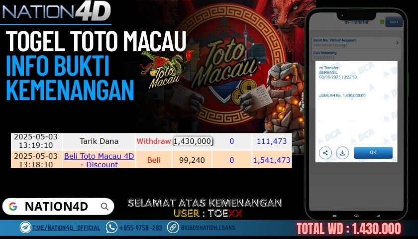 Selamat Kepada Member Setia NATION4D dengan USER ID : TOE** TOGEL TOTO MACAU sebesar RP.1.430.000,- LUNAS langsung mendarat ke rekening tanpa bertele – tele. Terimakasih telah mempercayakan NATION4D sebagai Situs Bandar Terpercaya dan Terjamin Aman! Tunggu apalagi? Daftar sekarang juga bersama NATION4D dan dapatkan berbagai promo menarik setiap harinya.